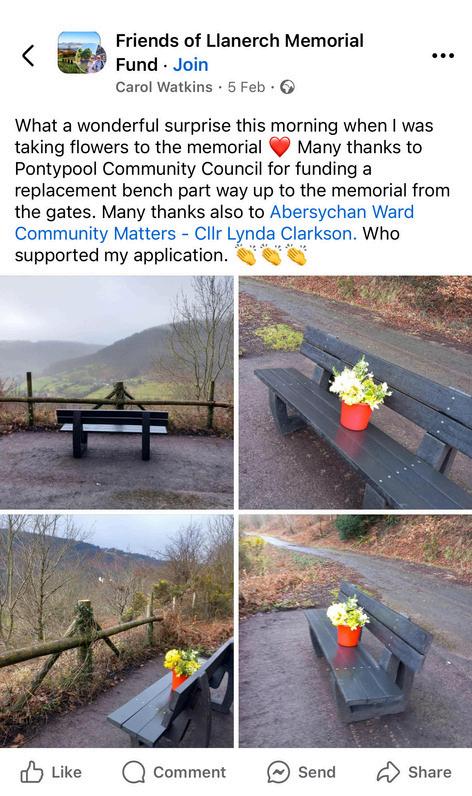 Pontypool Community Council have many benches located throughout Pontypool. This was a post on social media of one of them.