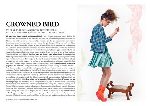crowned bird we chat to PRISCILLA Barroso, the founder & designer behind our NEW fAVE label, crowned bird. Tell us a little about yourself and Crowned Bird. I am a bespoke tailor that makes clothing for various artists and musicians in San Francisco. I started this umbrella company with negative 300 dollars in my bank account so I was one of the fortunate few that got lucky, but it’s been years in the making. A true ‘coming of age’ type story, minus the epic dialogue. Things just work out if they should and I know, because I’m a fatalist at heart. Crowned Bird is a testament to that. It’s a clothing line I designed specifically for the geeksters of our world. Not quite hipsters, but totally, relentlessly knowledgable about their craft, have an eye for timelessness, and a hearted approach to trends. We are endearing, harmless, and geek out on the things we love. If you can relate to any of those qualities, Crowned Bird was made for you. Your line has a very distinct style, where do you draw inspiration from? Inspiration always comes suddenly for me. I can spend a day frolicking through a city and by night I have the new season down on paper. The French retro theme isn’t just inherent, the rest is based on experience and staying present. I try my best to seize a small moment and draw it organically, then build a story through design. There are always ‘characters’ in my mind. Are you working on any new projects at the moment? I have just launched to wholesalers so I am heading to Paris for the Pret-aPorte show on my June 30th and will be making some fun fashion videos in the streets using a couple of my favorite Parisian fashion bloggers. Excited for all of the video projects to come with a very magical friend, Miss Heather Gildroy. What do you do when you’re not working on your designs? I seek out favorite haunts and new experiences. I’m boldly adventurous at times. But more than anything, I like to spend time with amazing people that fill my life somehow. It is symbiotic love. And then there is my pug, my everyday love affair. Best advice you’ve been given? Haters gonna hate. Where do you see the label going in the future? We will be taking this brand to Japan in the near future. I am meeting with the buyers from Beams+ who are already interested in the Spring 2013 collection, coming out in August. I’ll be relocating my business to Los Angeles this summer (yeah!) and have a beautiful showroom production space downtown I’m sharing with photographer Heather Gildroy. The next collection still carries a strong and adored nod to the past, but is a bit darker, in a neon sort of way. Where can our readers buy your lovely pieces? I will have to keep you posted on online and local retailers. Launching next week (California here we come!), you’ll have to check out our stockists page for up-to-date news. To find out more visit www.crownedbird.com