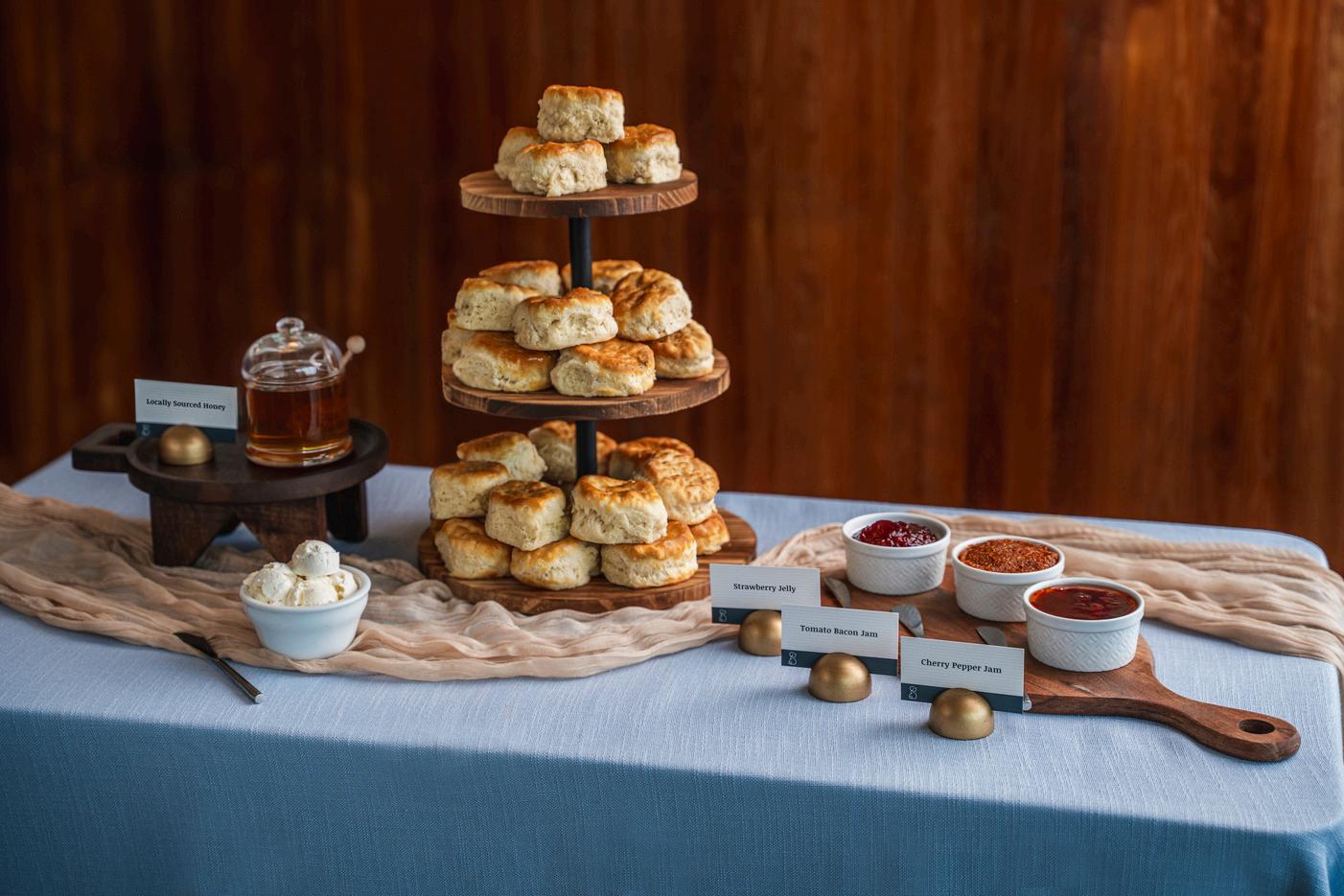 croissants, muffins, and danishes with whipped honey butter and jams