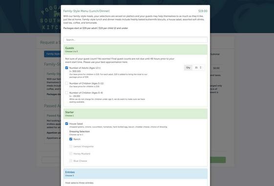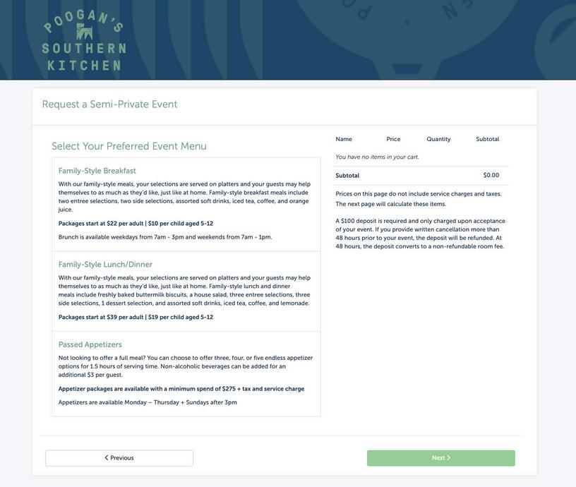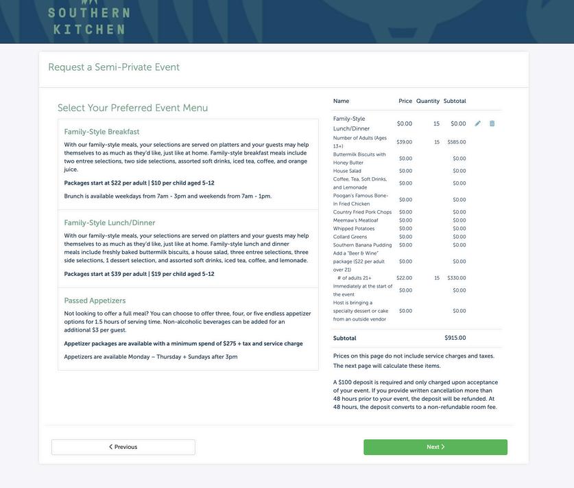 Now, select your menu package We offer two familystyle options: Lunch / Dinner, starting at $39 per adult, or Breakfast, starting at $22 per adult. (Note: Breakfast is only available during select hours.)