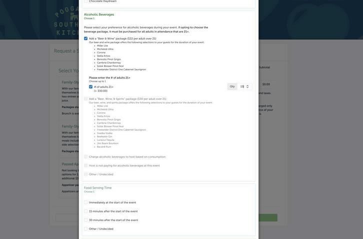 If you are selecting an alcoholic beverage package, check off your preferred package, then check off the box that says "# of adults 21+” and enter the quantity of adults over the age of 21 in the box to the right.
