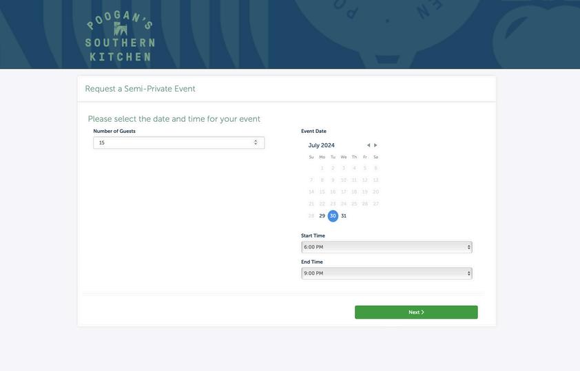 On the inquiry form, first, enter the number of guests you expect to attend (Don’t worry, this can change up to 48 hours before your event ) Then, select your preferred date and time. Click the green “Next” button to proceed.