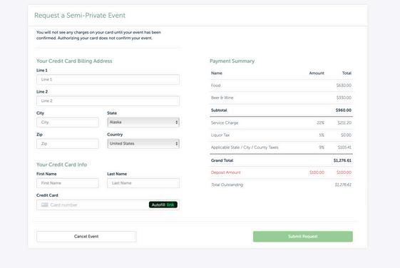 Finally, enter your credit card information. Your card will be charged a $100 deposit only upon acceptance of your event.