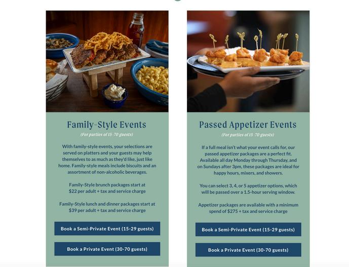 Then, scroll and select the blue booking button that applies to your group’s guest count: 15-29 or 30-70.