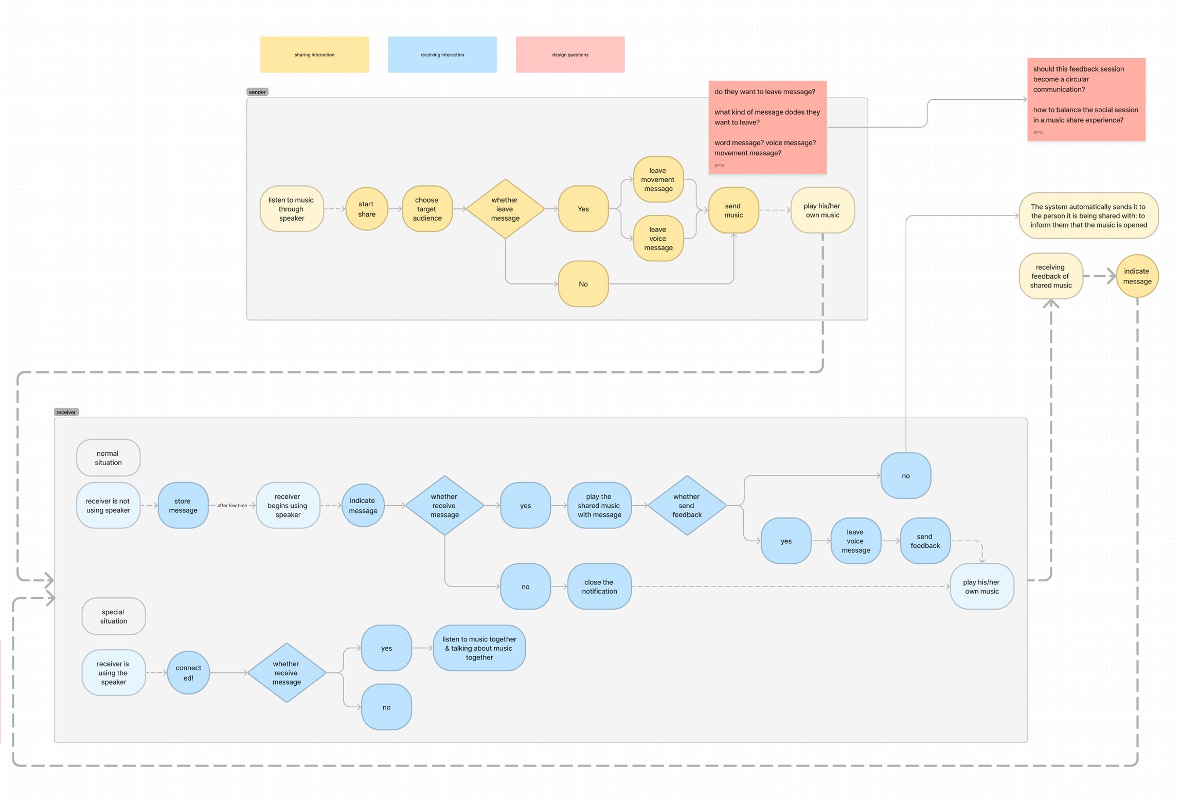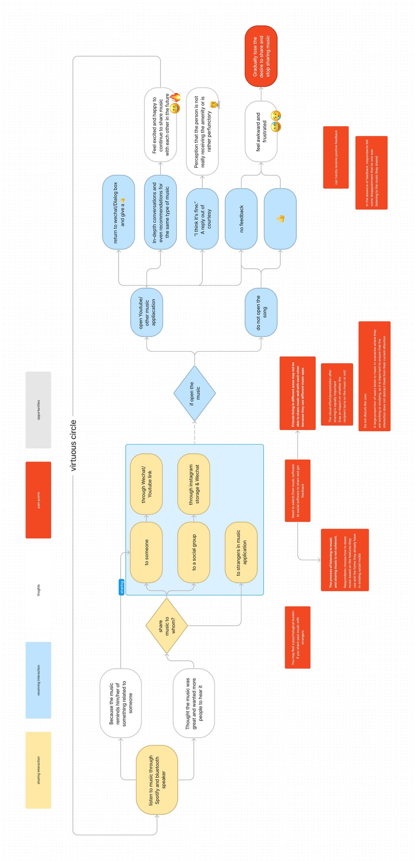 In order to have a more intuitive and complete understanding of the existing user experience of sharing music, based on the content of the user interviews and the Empathy map created, I have summarized the general flow of how users currently share music and the different situations that may occur, as shown in Figure 7.
