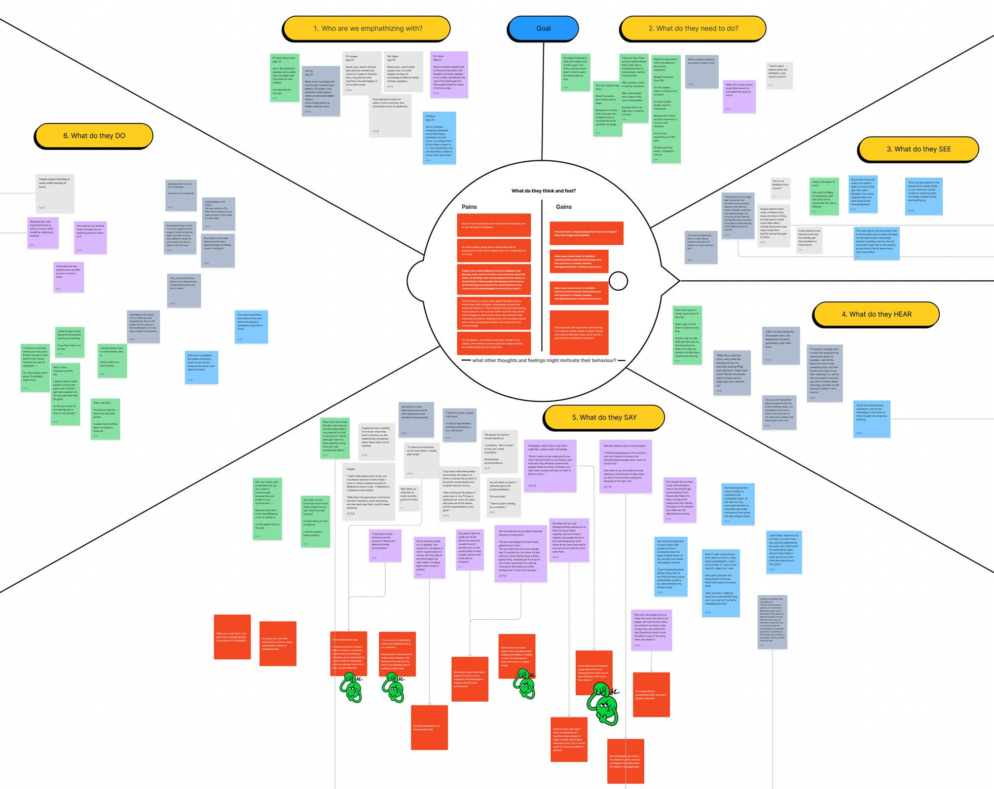 collected from the interviews into five areas - Say, Do, Think, Feel, Hear. The biggest insight for me is that designers should be more observant rather than questioning during the user research phase. In using the Empathy Map, I have found that there are often discrepancies between what users say and what they actually do, and that exploring the causes of these discrepancies can be very revealing for design purposes.