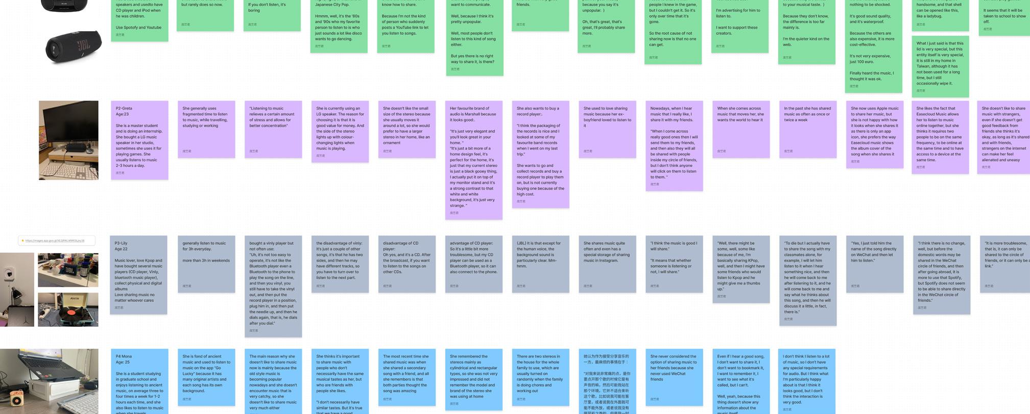 The in-depth user interviews provided me with a wealth of information about each interviewee's music, life, and even emotional connections. In order to analyze this information, I first chose to extract the key messages from the transcripts and created post-it notes to summarize them, which is shown in the Figure 5.