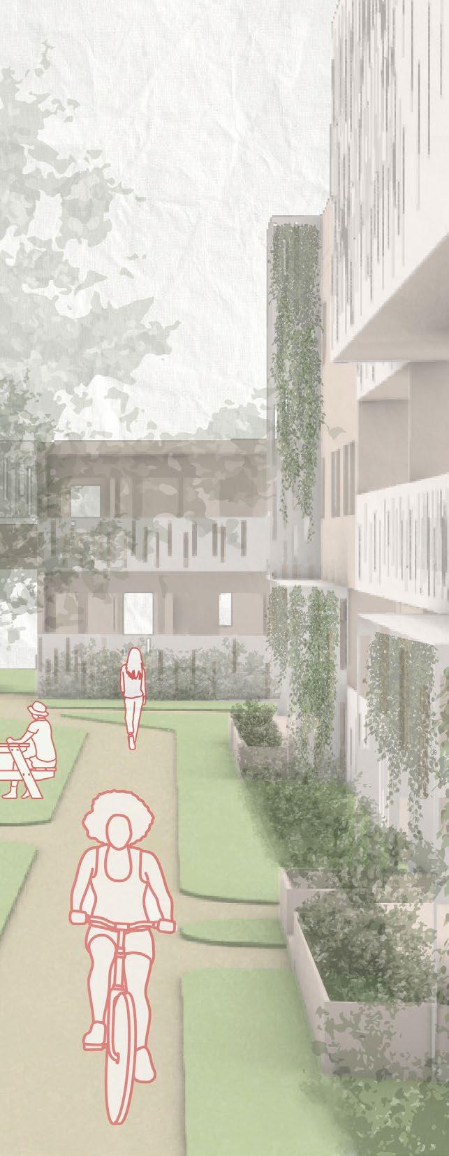 This affordable housing project prioritizes diverse and multigenerational households, challenging the assumption that most households are nuclear families. A cohesive and walkable community is designed through shared courtyards and amenities, a central farmer’s market, and pocket parks.