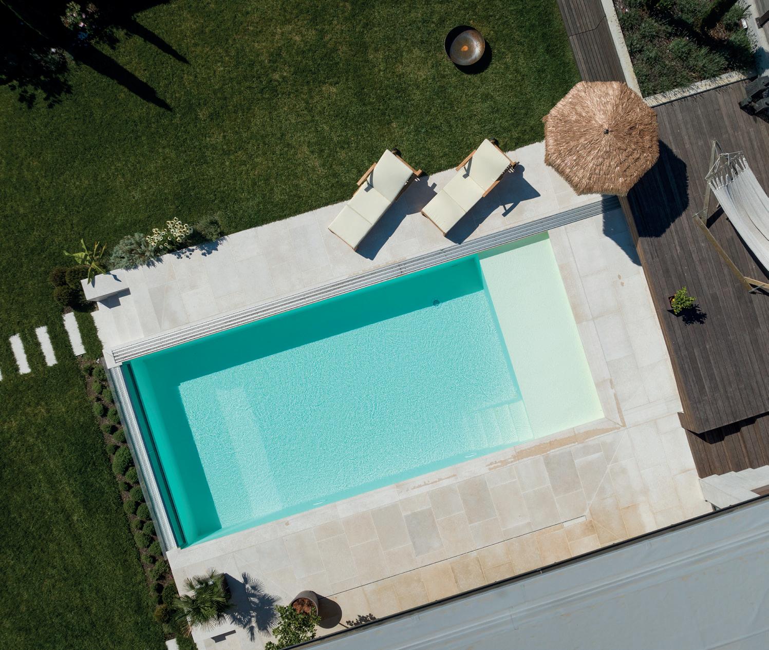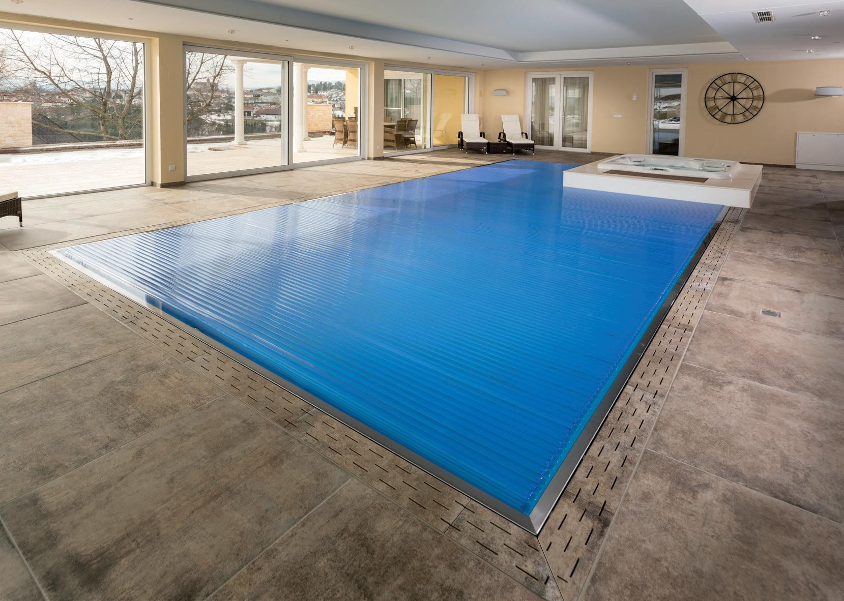 Unterflurrollläden sind eine dezente, äußerst elegante Variante, Ihr Schwimmbad abzudecken. Die direkt auf der Wasseroberfläche liegenden Lamellelen halten Schmutz aus Ihrem Becken und sorgen durch die reduzierte Verdunstung für konstantere Temperaturen und schnelleres Erwärmen Ihres Poolwassers.