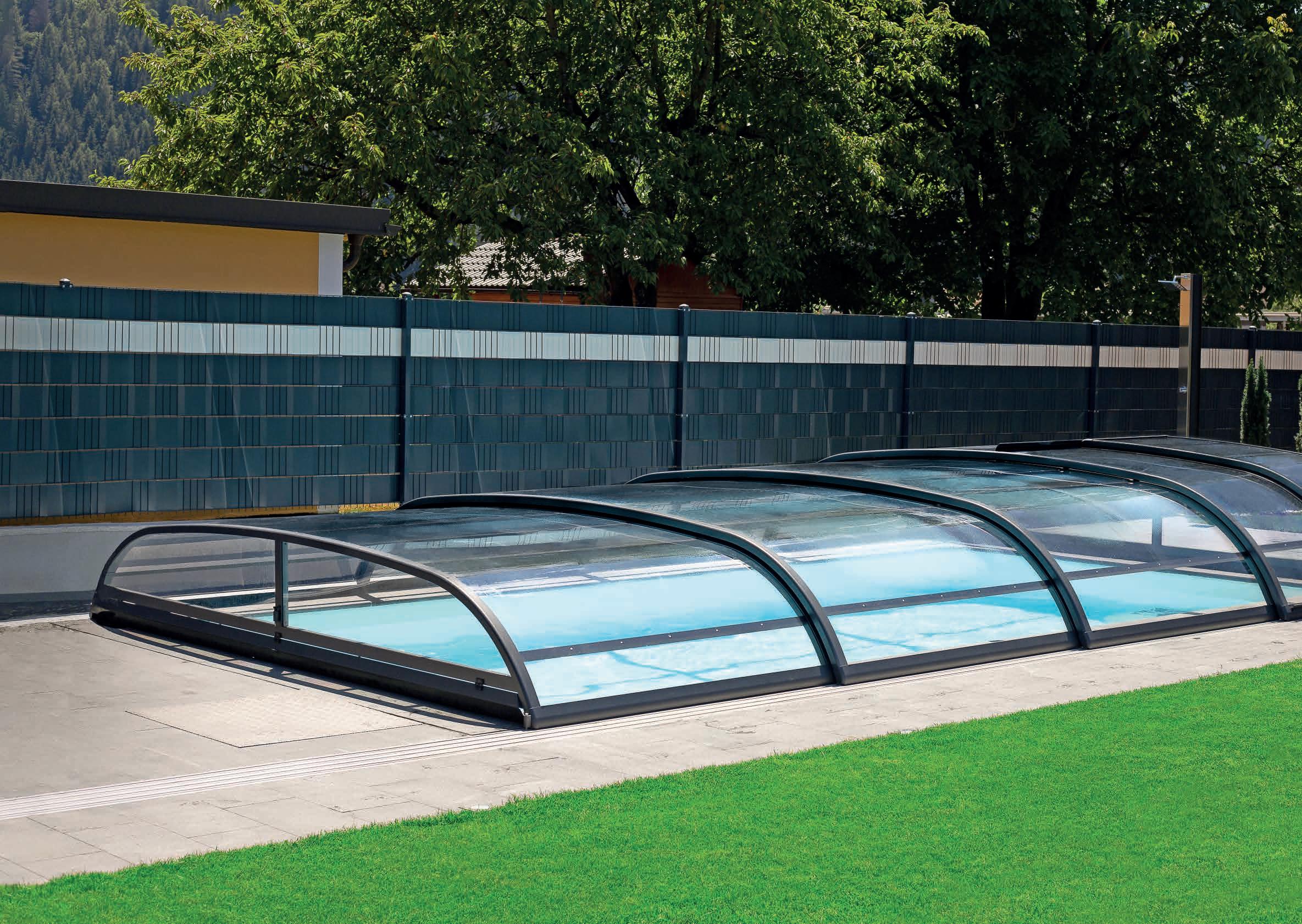Unsere hybride Lösung wurde speziell für Kunden entwickelt, die Ihr Becken ohne Abstriche auch in geschlossenem Zustand nutzen wollen. Die drei Varianten P, L und XL unterscheiden sich in ihrer Höhe. In der Ausführung L benötigt dieses Modell nur eine einseitige Laufschiene.