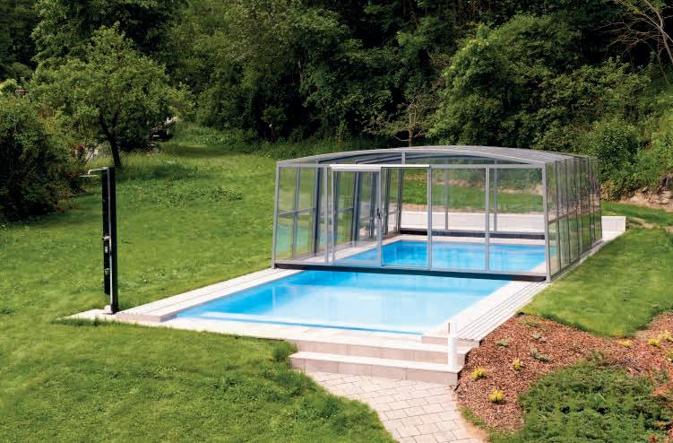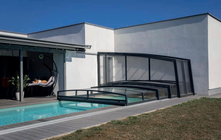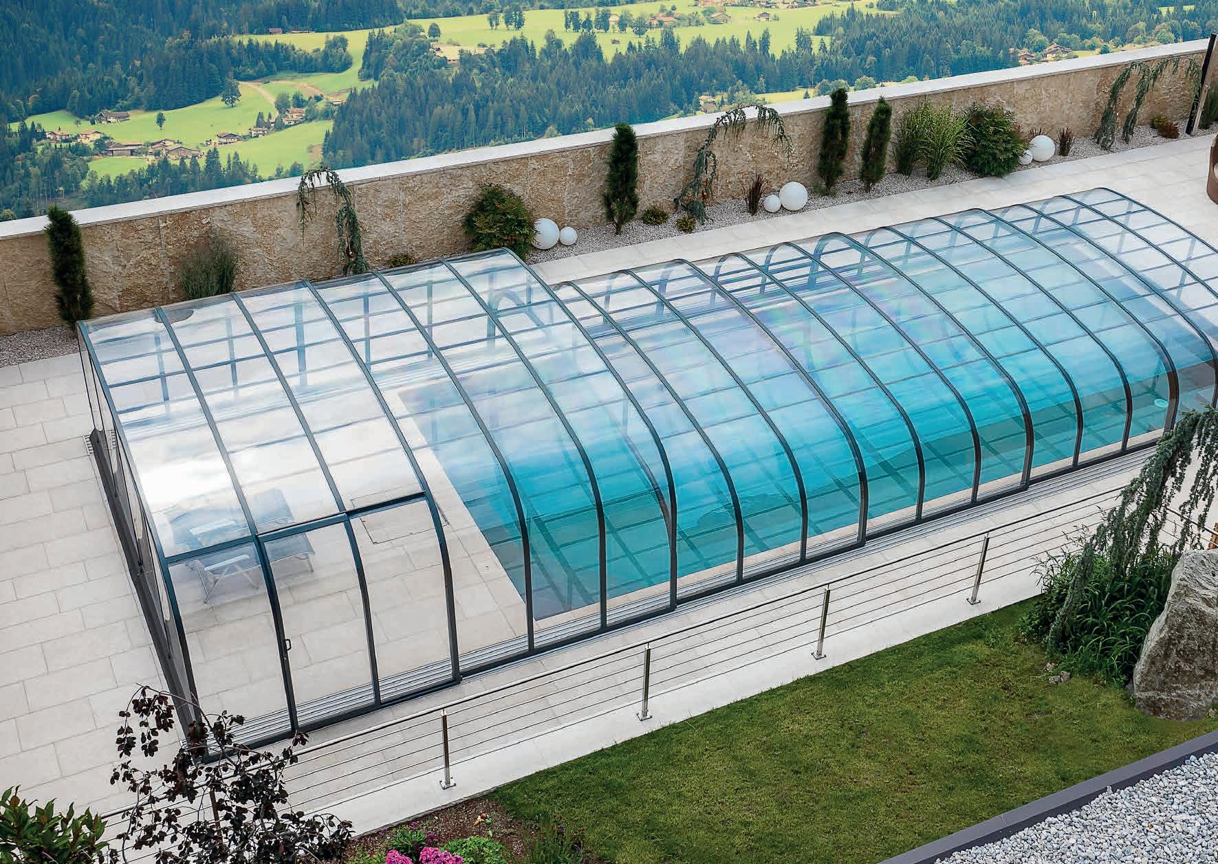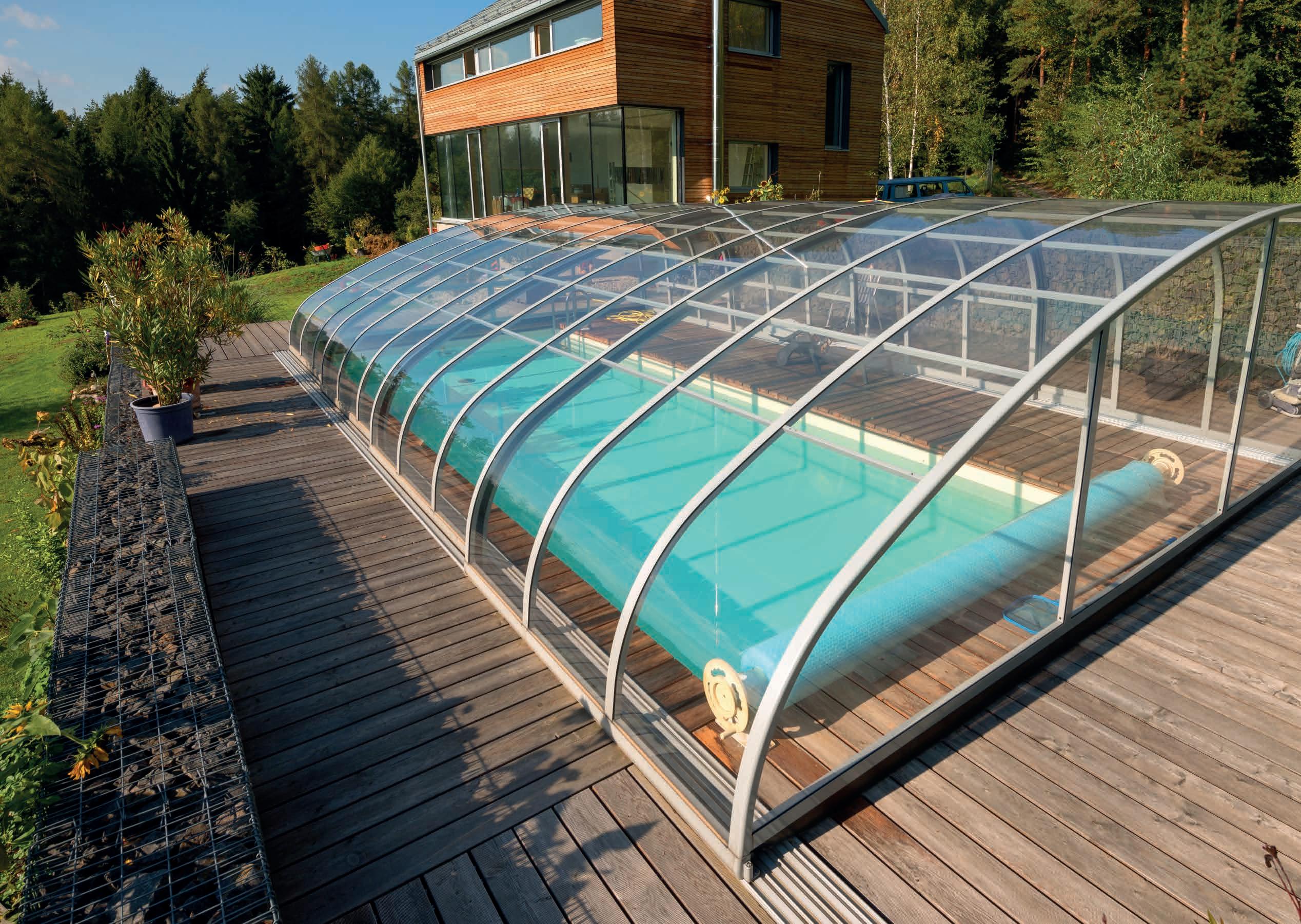 EN Our latest enclosure model opens up completely new pool possibilities. The generous height offers enough space for swimming and, with the appropriate length, can also be used as a lounge or sunbathing area. This model gets its stability and its unique look from the folded corners.