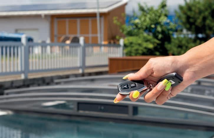 EN Opening and closeing at the push of a button: This is possible with the solar versions of our pool covers. For this purpose, we have developted and continuously optimized our cover engine over the years to guarantee maximum comfort when using your pool. Optionally with app or remote control.