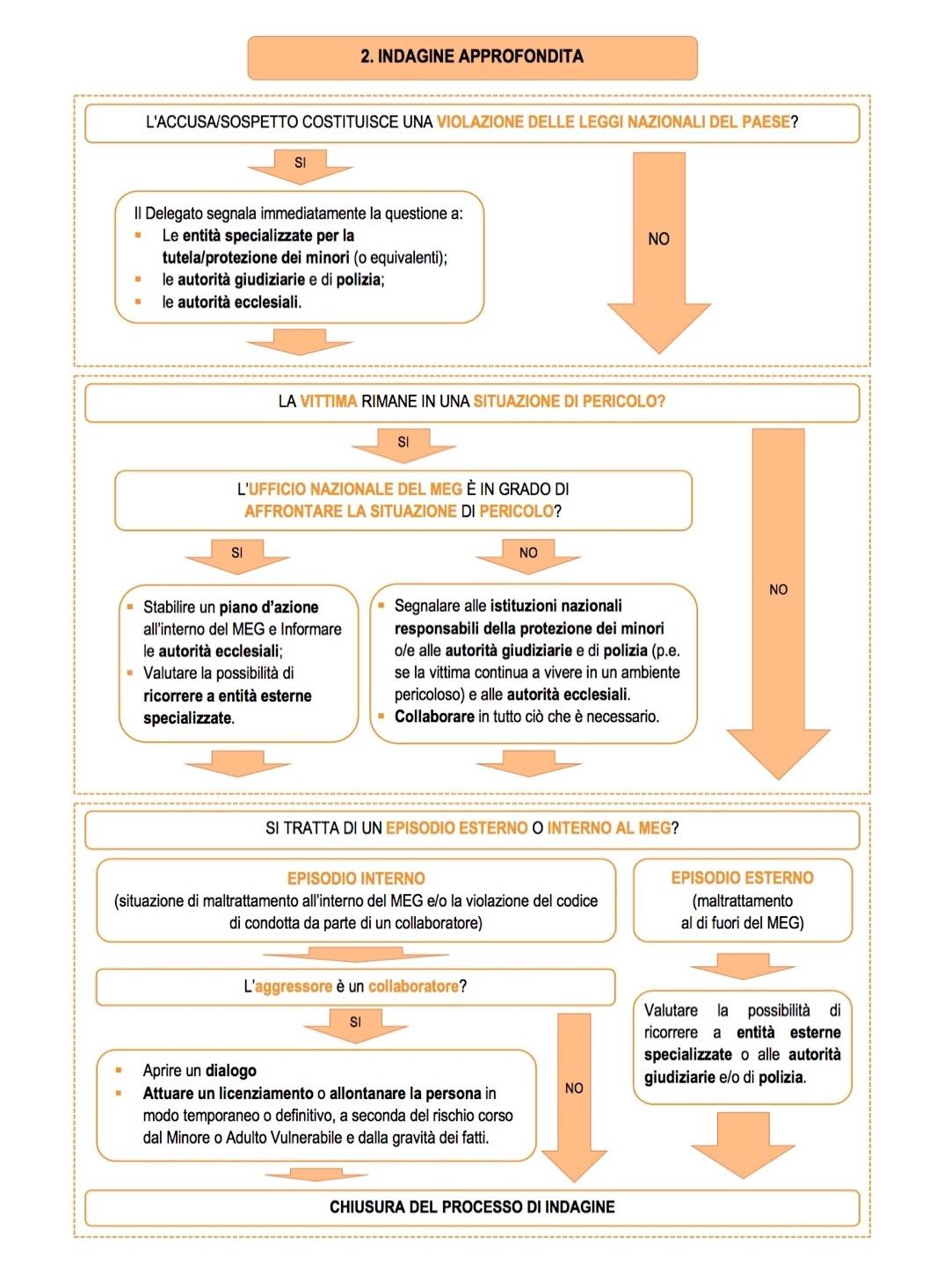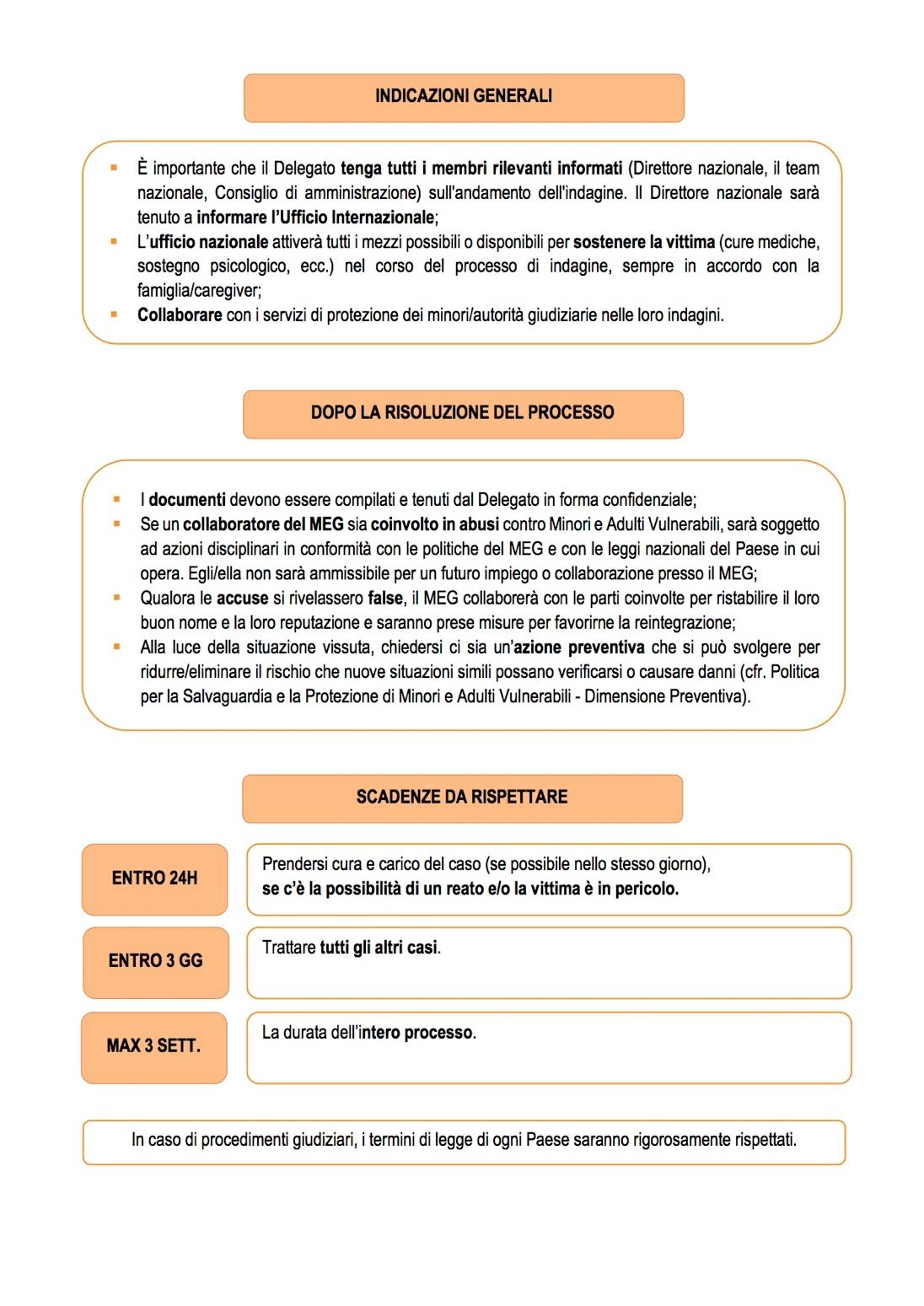 Procedure messe in atto per rispondere a tutte le accuse e/o ai sospetti di abuso su Minori e Adulti Vulnerabili. La protezione e la sicurezza di Minori e Adulti Vulnerabili è preoccupazione di primaria importanza. I centri regionali o nazionali del MEG si impegnano a intraprendere qualsiasi azione necessaria per garantire che i Minori e Adulti Vulnerabili ricevano il più alto standard di assistenza disponibile.