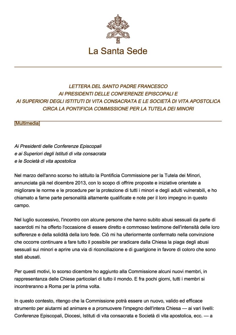 «Nel marzo dell'anno scorso ho istituito la Pontificia Commissione per la Tutela dei Minori con lo scopo di offrire proposte e iniziative orientate a migliorare le norme e le procedure per la protezione di tutti i minori e degli adulti vulnerabili. [...] Chiedo la vostra collaborazione piena e attenta [...] per il reciproco scambio di “prassi virtuose” e di programmi di educazione, formazione e istruzione per quanto riguarda la risposta da dare agli abusi sessuali.»