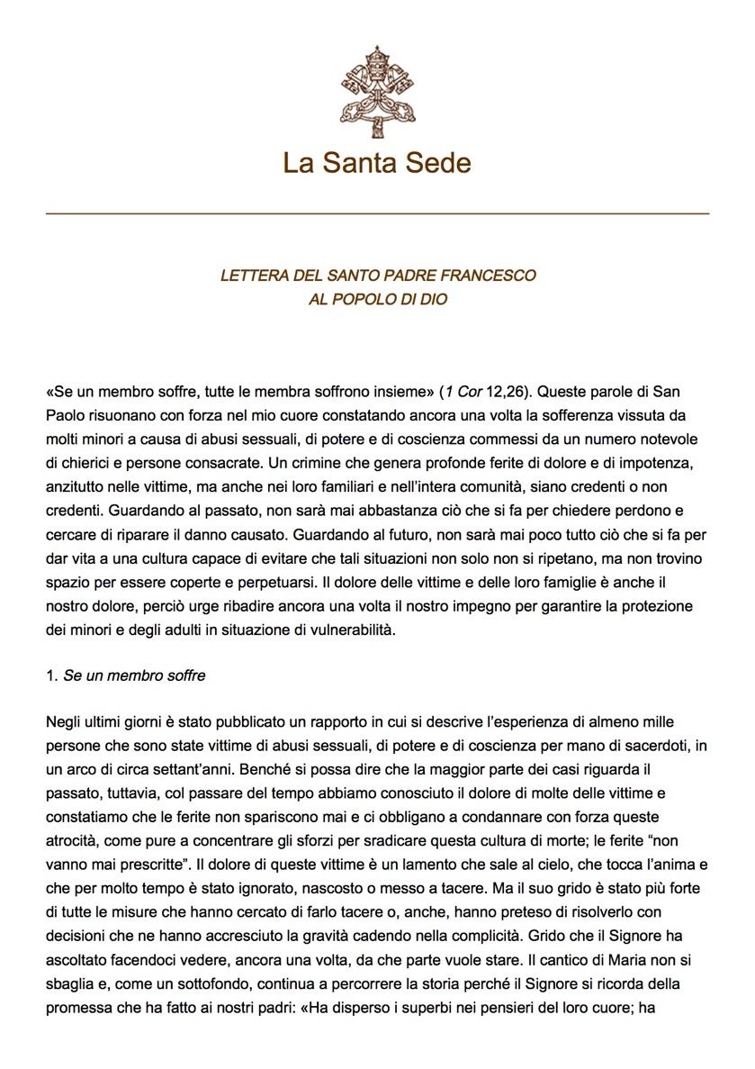 1 Lettera del Santo Padre Francesco al Popolo di Dio: http://www.vatican.va/content/francesco/it/letters/2018/documents/papafrancesco_20180820_lettera-popolo-didio.html