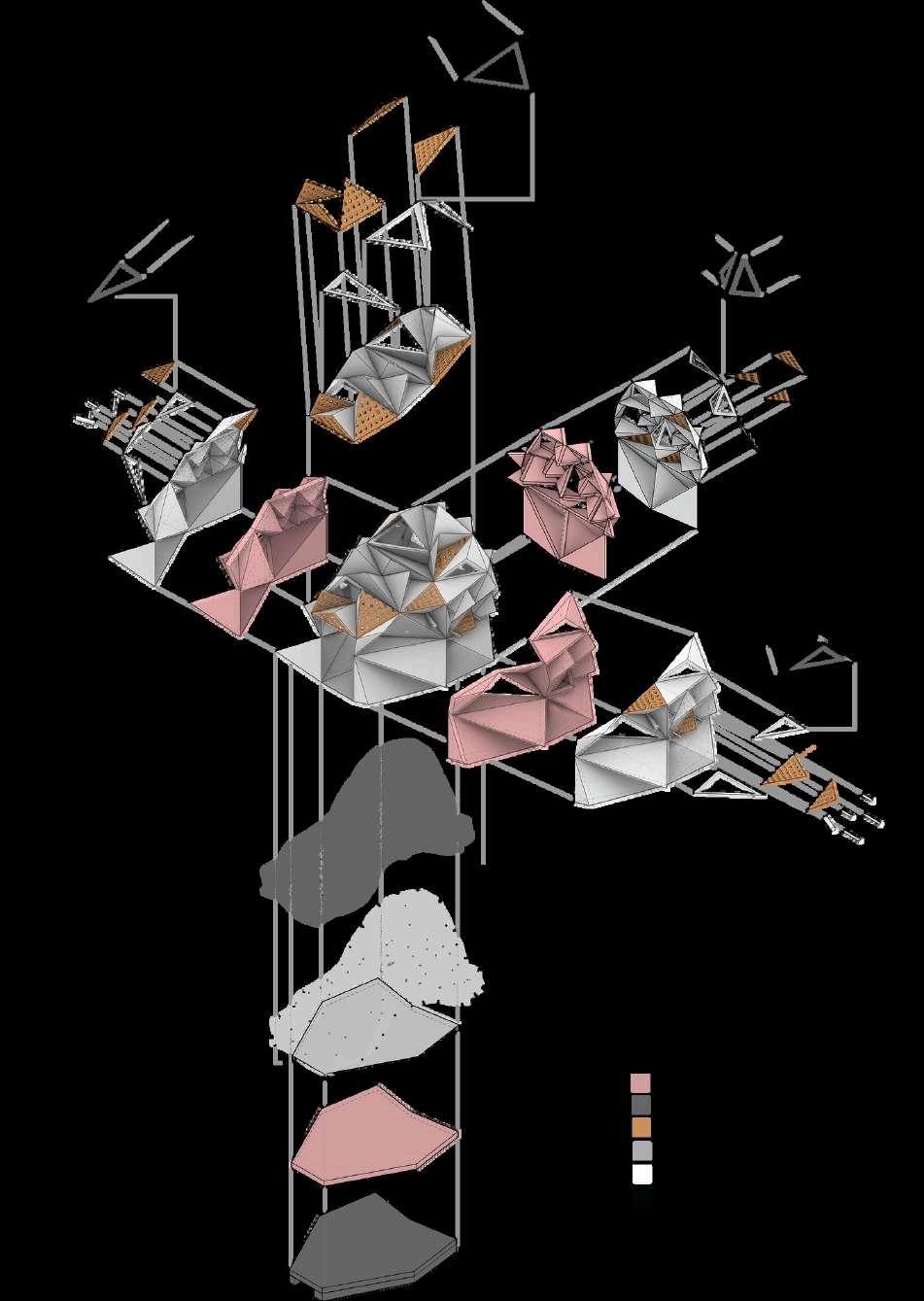 BRYANT PARK, NEW YORK CITY TREATING PYRAMIDS AS OUR UNIT, WE PUSH AND PULL THEIR MEASUREMENTS TO ACCOMMODATE FOR DIFFERENT SCALES, HUMAN AND ANIMAL, AND TO FULFILL 3 DIFFERENT PROGRAMS IN THE SPACE: WORK, LOUNGE, AND EXHIBIT. WITH THE NET MESH INSIDE AND THE ROCKY ROOF, WE AIM TO FACILIATE AN ACT OF NESTING IN THIS SPACE.