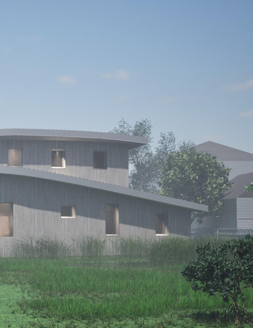 With a swirving form, the Solar Crescent seeks to balance the areas of visibility, passive design and livability. Located in Portland, Maine, the CL House is a 1,115 square foot, 2 bedroom, 1 nursery/offce, 1 bathroom ADU.