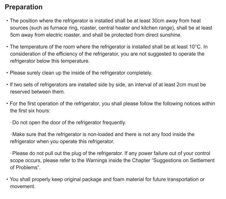 • Please unplug this refrigerator from the power outlet before cleaning or defrosting.