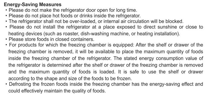 • Defrosting frozen food inside the freezer compartment has an energy-saving effect and can effectively maintain the quality of the food.