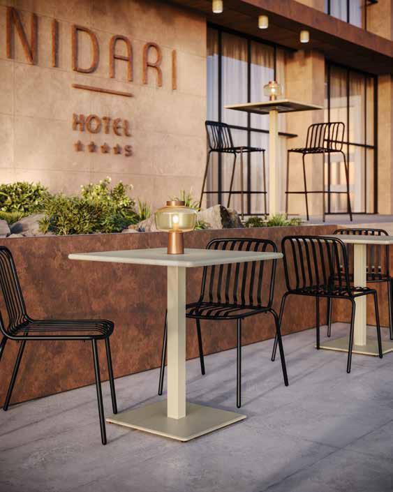 The Saponetta Collection is the result of Nitesco International S.p.A.’s long experience in supplying tables to the HO.RE.CA world, both for indoor and outdoor use. The steel plate placed on the base is subject to cold mould deformation, which determines a shaped sloping perimeter, a shape that naturally absorbs the impact of abrasive bodies on it, minimizes the volumetric impact of the adjustable feet, thus determining an aesthetic, high design value that can be easily perceived.