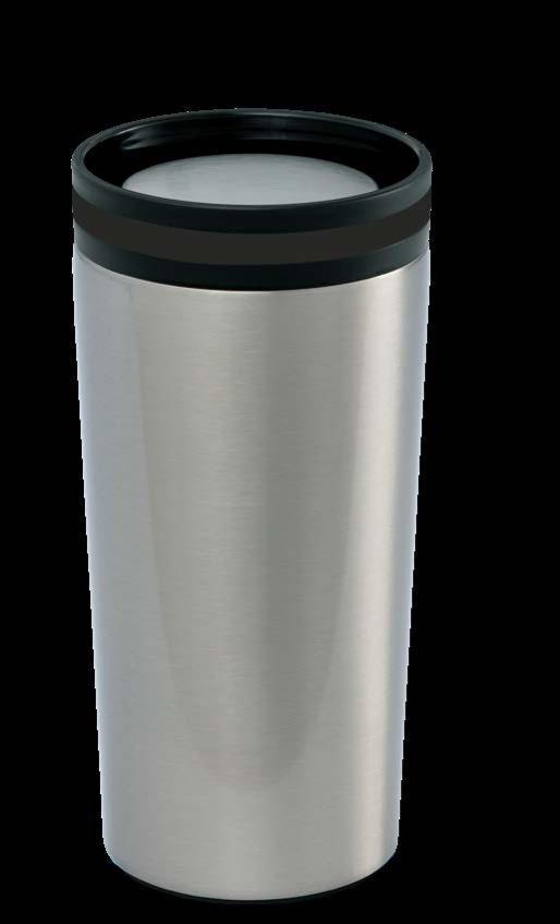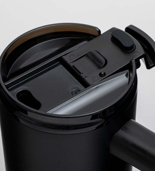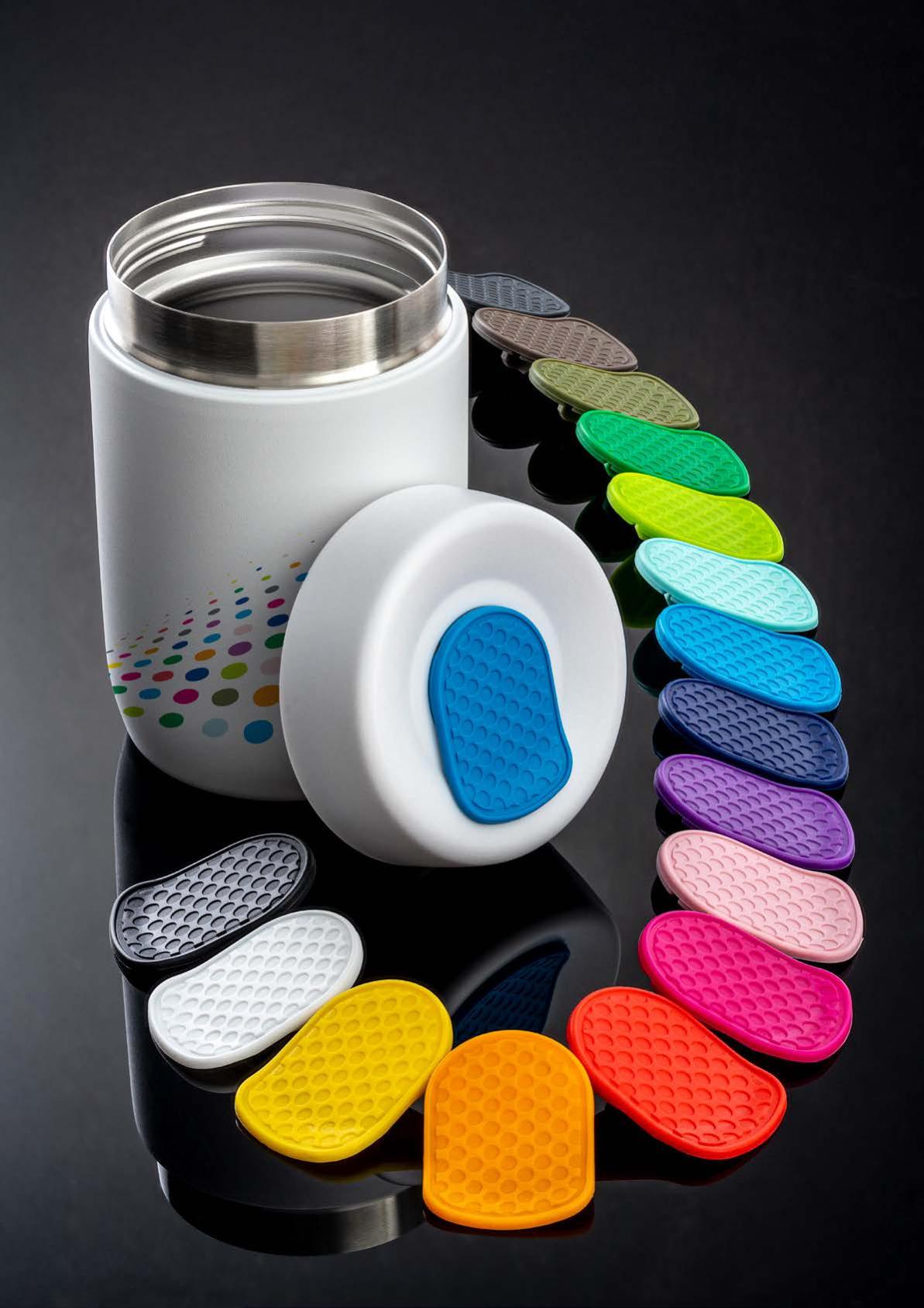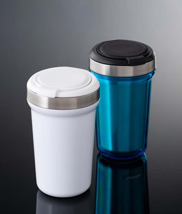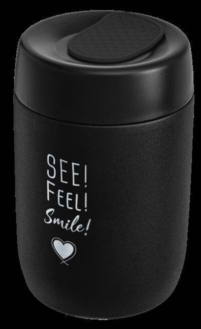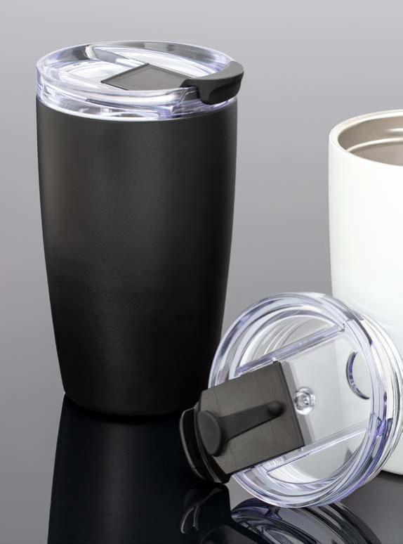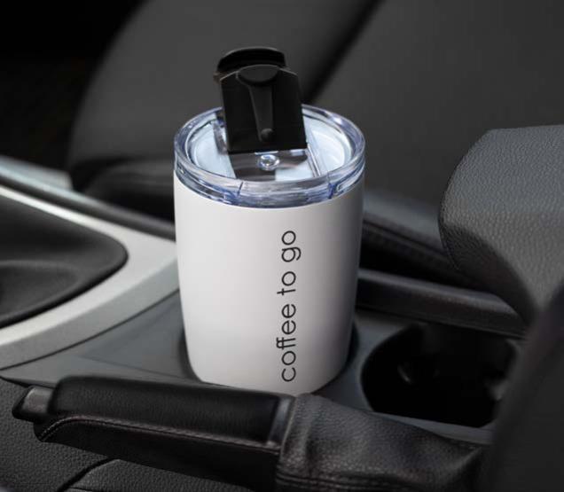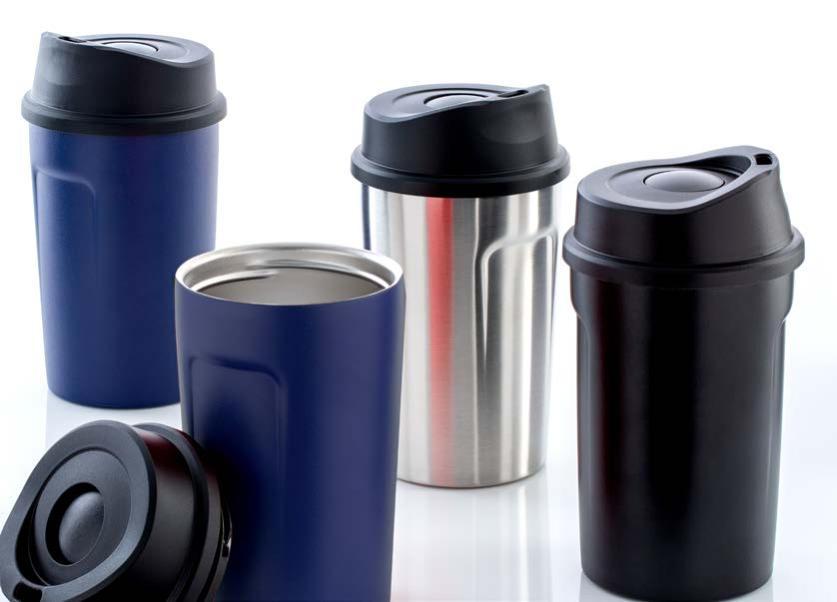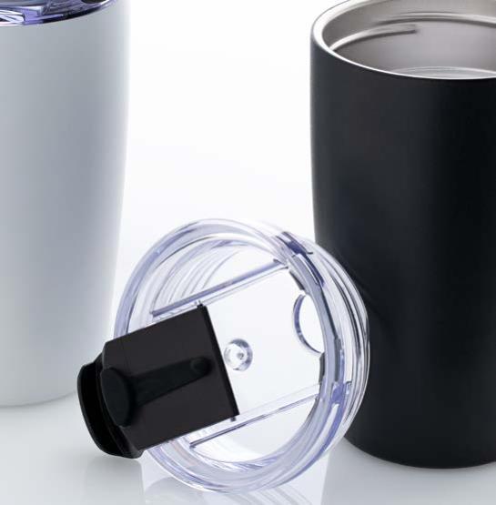 Während die Modelle eine weiße Innenbeschichtung besitzen, ist die schwarze Tasse auch Innen schwarz. Hergestellt aus recyceltem Edelstahl, erweist sich die doppelwandige Thermotasse als robust und langlebig. Die Isolation hält Ihre Getränke bis zu 4 Stunden warm oder 24 Stunden kalt. Die äußere Pulverbeschichtung sorgt für eine ansprechende Optik und angenehme Haptik. Ein auslaufhemmender Steckdeckel aus PP- und AS-Kunststoff ist optional erhältlich. Dabei können Sie den Schiebeverschluss aus 17 verschiedenen Farben wählen. Der Softboden aus TPR-Kunststoff bietet Rutschschutz und schützt die Tasse und den Untergrund vor Kratzern.