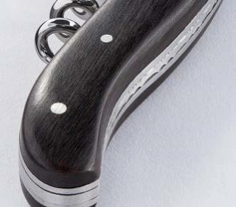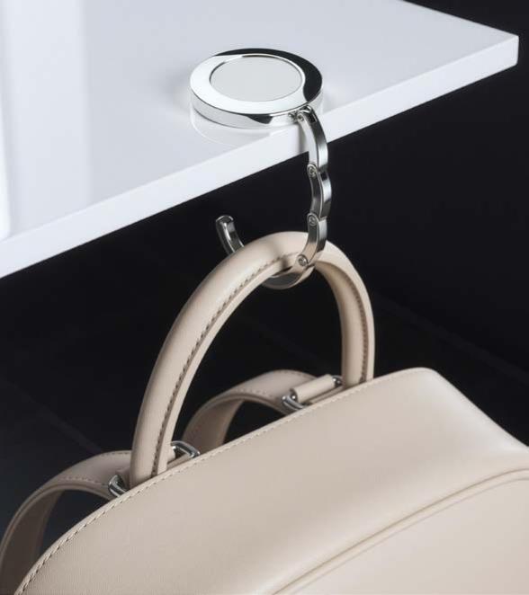 Ein nützliches, kleines Tool, nicht nur für Handtaschen und Rucksäcke, sondern auch für Jacken und Mäntel. Der zusammenfaltbare Taschenhaken in schöner, schwarzglänzender Gunmetal-Plattierung.