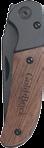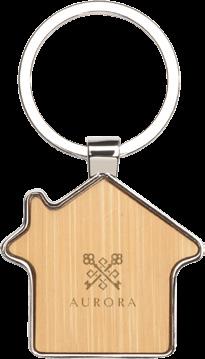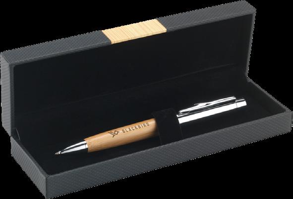 Blau- oder schwarzschreibender Kugelschreiber mit schickem Bambusgehäuse, Chromringen und Metallclip/-druckknopf. Maße: Ø 1,1 x 14 cm. 17 g.