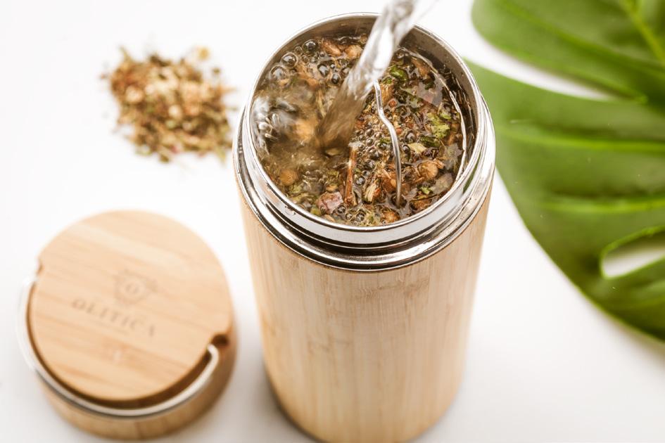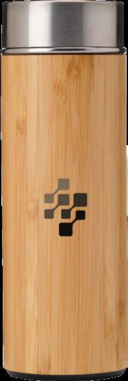 Doppelwandige, vakuumisolierte, auslaufsichere, Thermoflasche/ Thermobecher aus Edelstahl mit BambusFinish. Inklusive herausnehmbarem Teesieb aus Edelstahl.