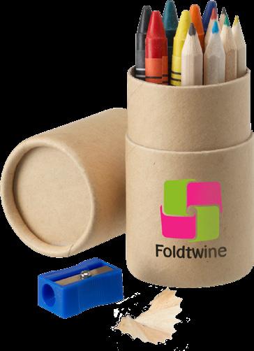 Karton-Köcher mit 6 unlackierten Buntstiften, 6 Wachsstiften und einem Anspitzer. Maße: Ø 4,5 x 10 cm. 70 g.