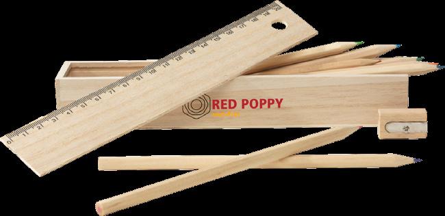 Hölzerne Verwahrbox mit Deckel (Lineal 20 cm), 12 unlackierten, angespitzten Buntstiften und hölzernem Anspitzer. Maße: 20,8 x 4,4 x 3 cm. 107 g.