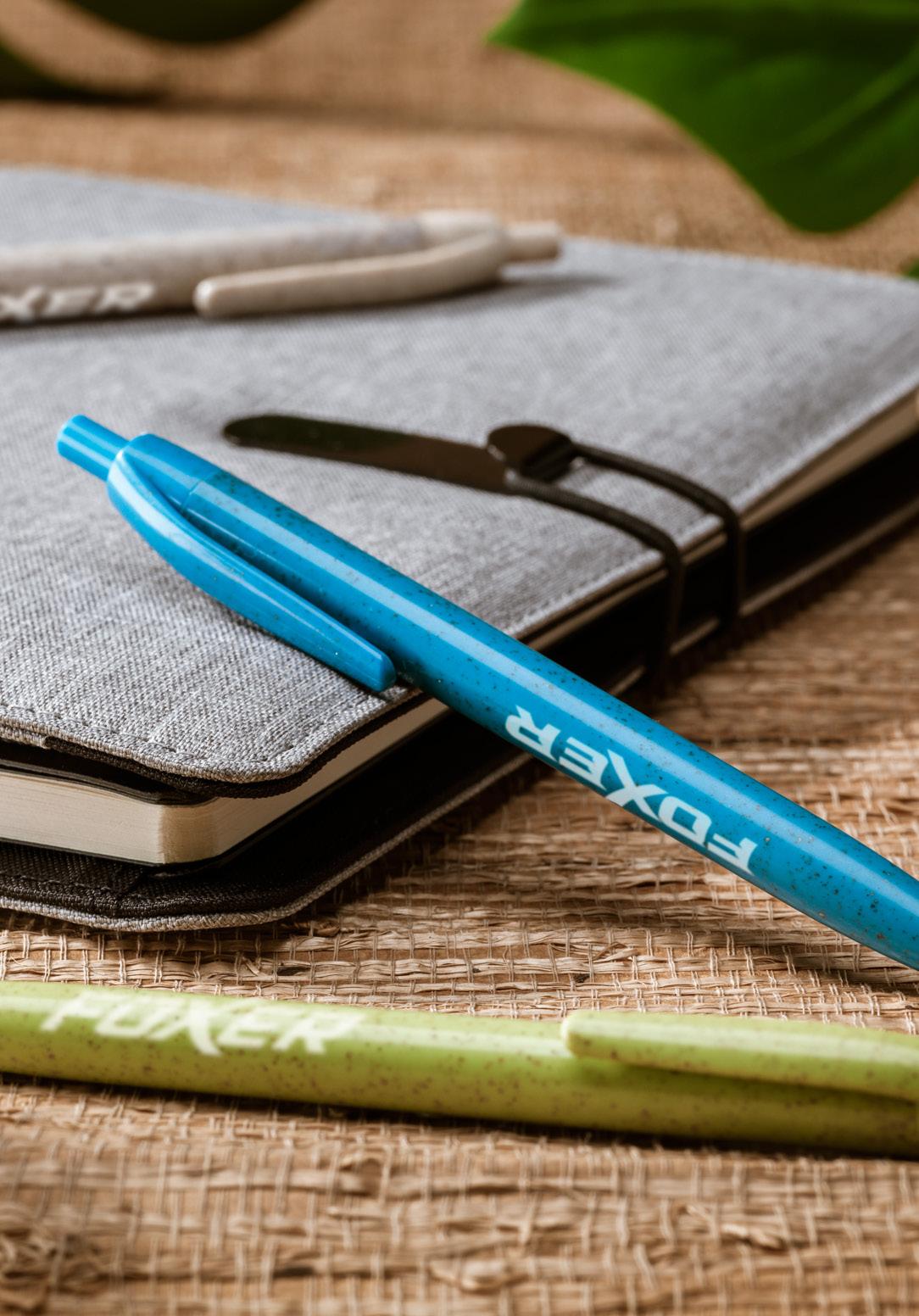 Umweltfreundlicher, blauschreibender Kugelschreiber, hergestellt aus 60% Weizenstroh und 40% ABS. Griff, Clip und Druckknopf sind aus den Resten geernteter Weizenstängel gefertigt. Mit großzügigem Clip für auffälligen Aufdruck. Maße: 13,8 x 1,2 x 1,5 cm. 8 g.