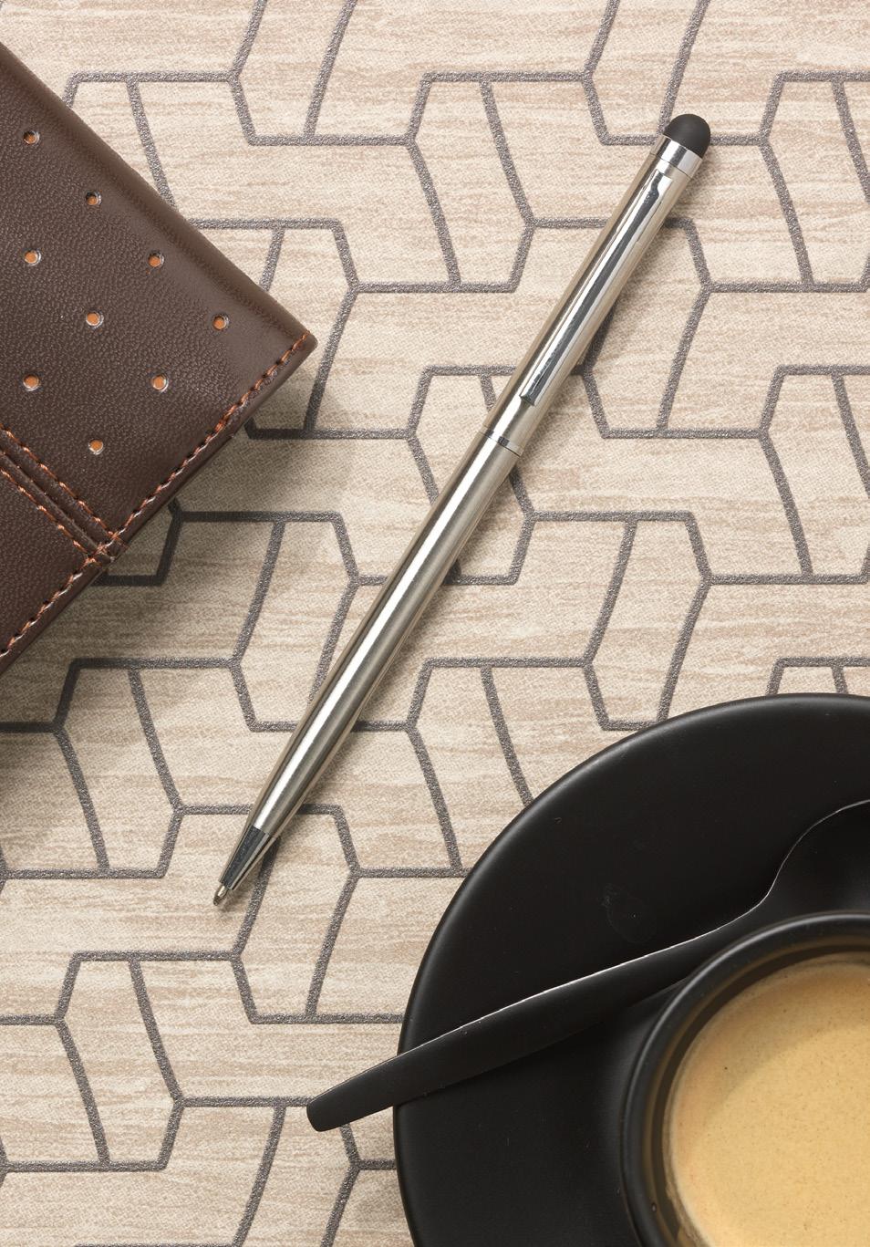 Eleganter, blauschreibender Kugelschreiber mit schlankem Gehäuse aus gebürtetem und poliertem rostfreien Edelstahl. Mit gummierter Spitze, um Touchscreens zum Bedienen von Touchscreens, Drehmechanismus und metallenem Clip, Spitze, Ring und Oberteil. Maße: 13,6 x 0,9 x 0,8 cm. 11 g.