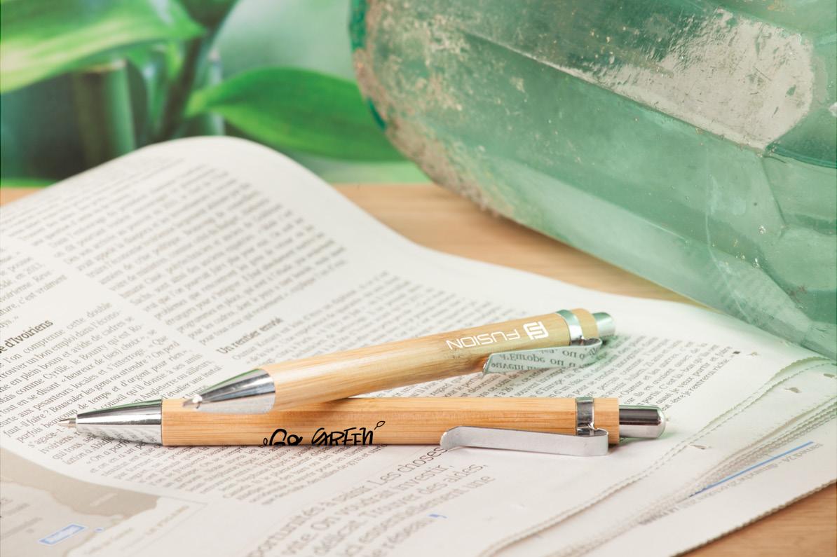 Blauschreibender oder schwarzschreibender Kugelschreiber mit Bambusgehäuse und Metall-Clip. Für umweltfreundliche Werbung. Maße: Ø 1,1 x 13,8 cm. 7 g.