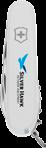 Blauschreibender oder schwarzschreibender Kugelschreiber mit weißem Gehäuse, farbigem, grifffestem Vorderstück und Metallclip.