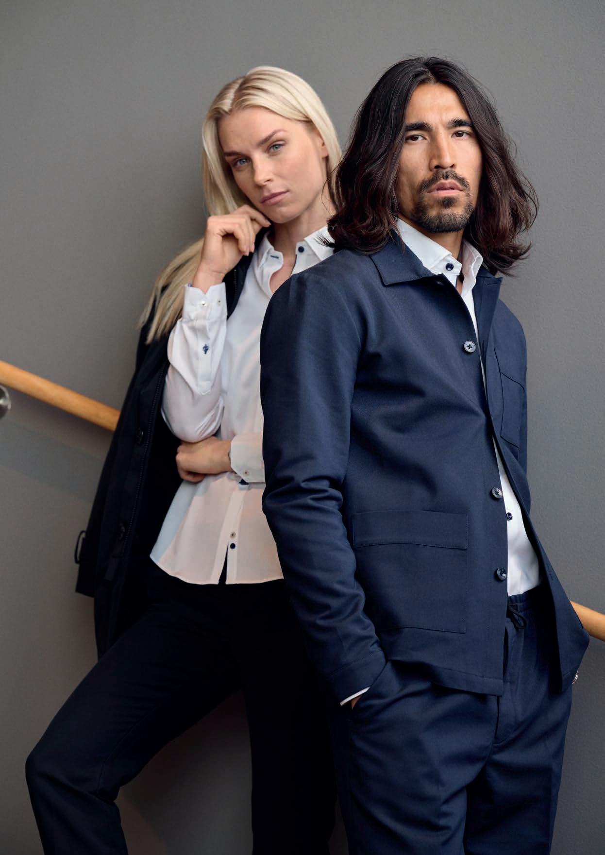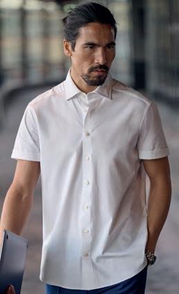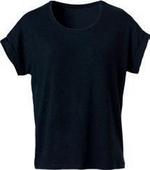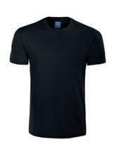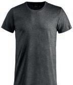 T-Shirt aus extra weicher Baumwolle, körpernah geschnitten, Nackenband und Kragen sind mit Elastan versetzt, verstärkte Schulternähte, waschbar bis 60°C. Herrenmodell in Rundstrick, Damenmodell mit Seitennähten.