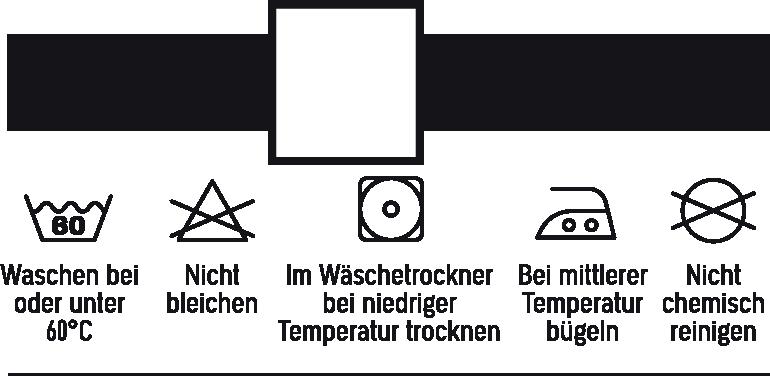 Das Wasserbecken zeigt, daß das Kleidungsstück sowohl mit der Hand als auch in der Maschine, inklusive normalem Schleudergang mit der empfolenen Temperatur gewaschen werden kann. Diese Temperatur sollte unbedingt eingehalten werden. Ein Ausfärben kann nicht nur bei heißem, sondern auch bei kaltem Wasser erfolgen. Bei durchgestrichenem Wasserbecken ist die Wäsche nicht erlaubt.