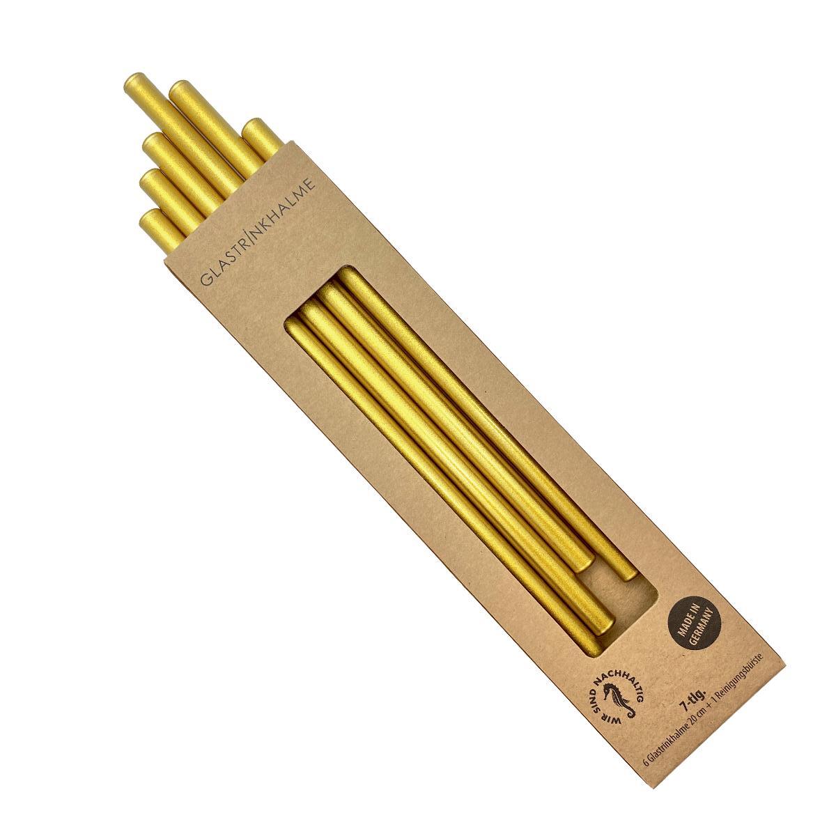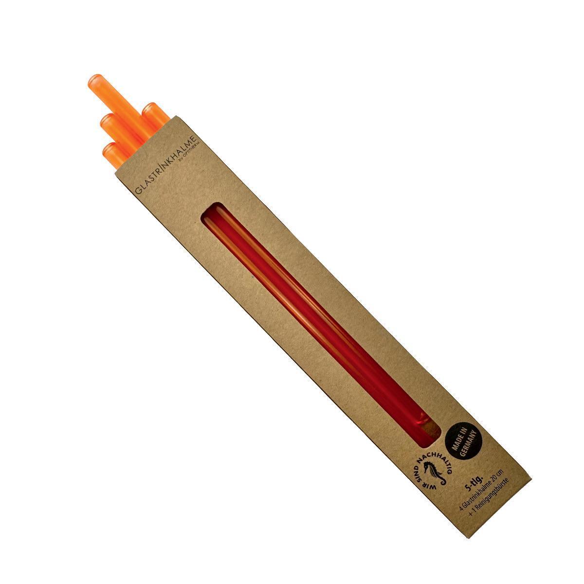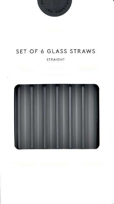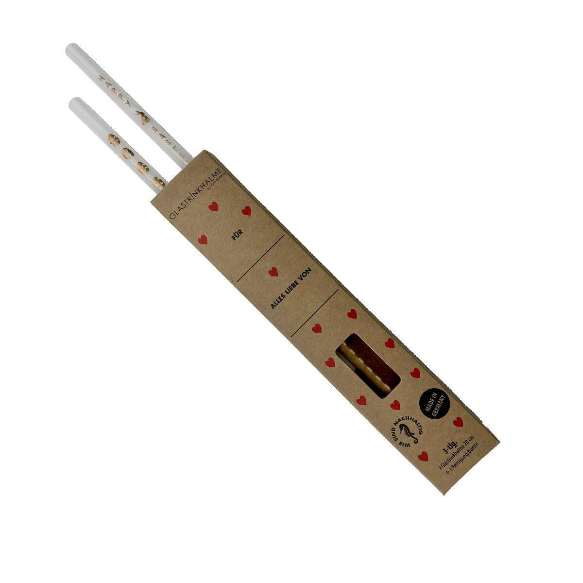 Recyclebare Glastrinkhalme, spülmaschinengeeignet, lebensmittelecht und geschmacksneutral. Standardmaß 200 x Ø 8 mm, in glasklar oder 31 Farben ab Lager. Verpackung naturbraun mit Fensterstanzung. Werbeanbringung auf den Trinkhalmen per Lasergravur, 5 x 40 mm (L6-2 für 2-er Set, L6-4 für 4-er Set, L6 für 6-er Set) oder lebensmittelechtem Siebdruck, bis 25 x 70 mm (D6-2 für 2-er Set, D6-4 für 4-er Set, D6 für 6-er Set).