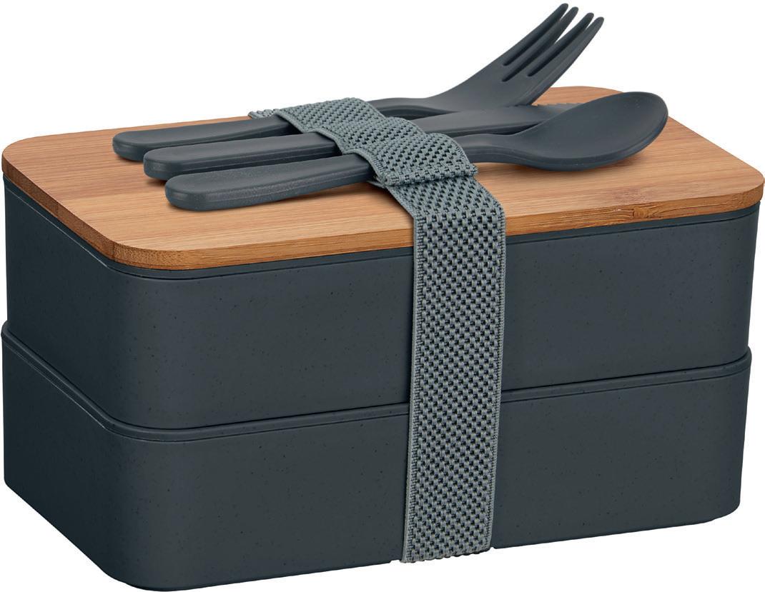N-m 561. Alle Eigenschaften eines Bestsellers in einer schlichten Dose vereint: 2 x 500 ml Inhalt, Besteck, Frühstückbrett! Material: PP, Bambus. Gewicht: 408 g. Maße: 180 x 105 x 92 mm. Werbeanbringung: auf der Seitenfläche, 50 x 30 mm (D2, UV3) auf dem Deckel, bis 50 x 30 mm (L4), bis 70 x 50 mm (L5)