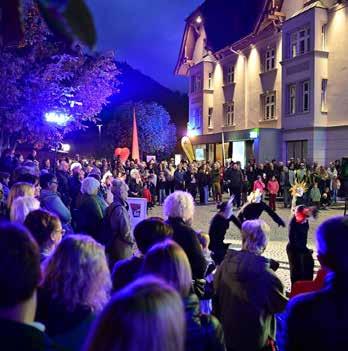 Gassen von Schruns. Eröffnet wurde die Kunst- und Einkaufsnacht von WIMO-Obmann Tobias Stergiotis, begleitet von Landtagsvizepräsidentin Monika Vonier, die als Vertreterin der heimischen Politik auftrat. Heike Montiperle führte charmant durch den Abend und stellte die teilnehmenden Künstlerinnen und Künstler vor. Ein besonderer Blickfang war die Luftakrobatin Ines Mifsud aus Schruns, die mit ihrer eleganten Darbietung im schwebenden Ring am Münsterplatz das Publikum begeisterte. Für dynamische Akzente sorgte zudem die Tanzgruppe der Musikschule Montafon, die mit ihren Flashmobs als Walking Act die vier Jahreszeiten tanzend inszenierte.
