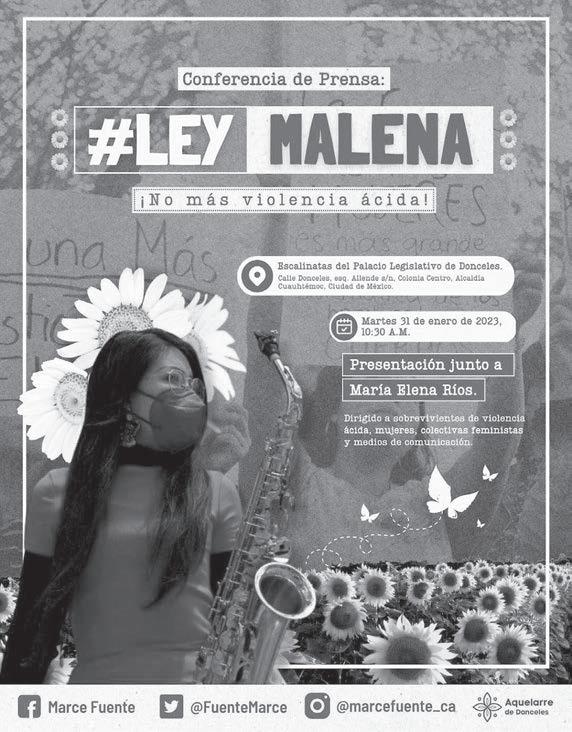 La diputada Marcela Fuente explicó que la iniciativa lleva el nombre de la saxofonista oaxaqueña María Elena Ríos, quien fue víctima de intento de feminicidio mediante un ataque con ácido, en el 2019, y agregó que con esta propuesta se pretende tipificar el delito de ataque con ácido, es decir, que no se considere un agravante en los delitos de lesiones, sino un delito en sí mismo.