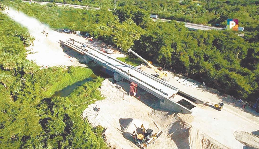 Igualmente, en el tramo 2, de Escárcega a Calkiní, continúa el levantamiento del Viaducto de Santiago, en Hampolol, Campeche, donde ya se encuentran colados los pilotes.