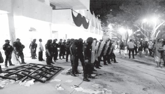 La Secretaría de Seguridad Ciudadana (SSC) de la capital desplegó a cientos de policías, quienes confrontaron a mani festantes en algunos puntos del recorrido ante la presencia de en capuchados que realizaron pintas en muros y arrojaron piedras a negocios del Centro Histórico.