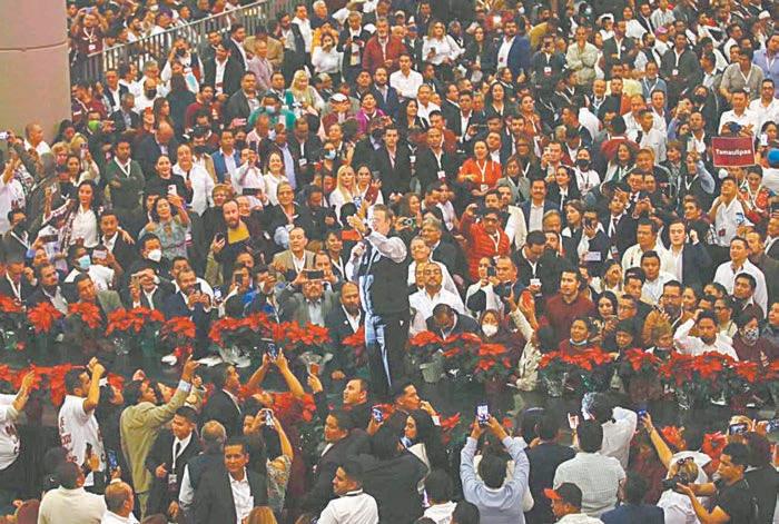 Ebrard recorrió un largo pasillo con vallas metálicas donde saludó a los asistentes que arribaron de los 300 distritos electorales del país.