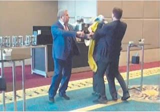 En las imágenes se observa a Oleksandr Marikovski, un parlamentario ucraniano, propinó varios golpes en la cabeza a un funcionario ruso, luego de que le arrebató una bandera ucraniana de las manos durante la cumbre celebrada en el Parlamento turco.