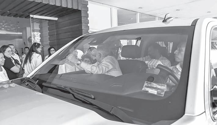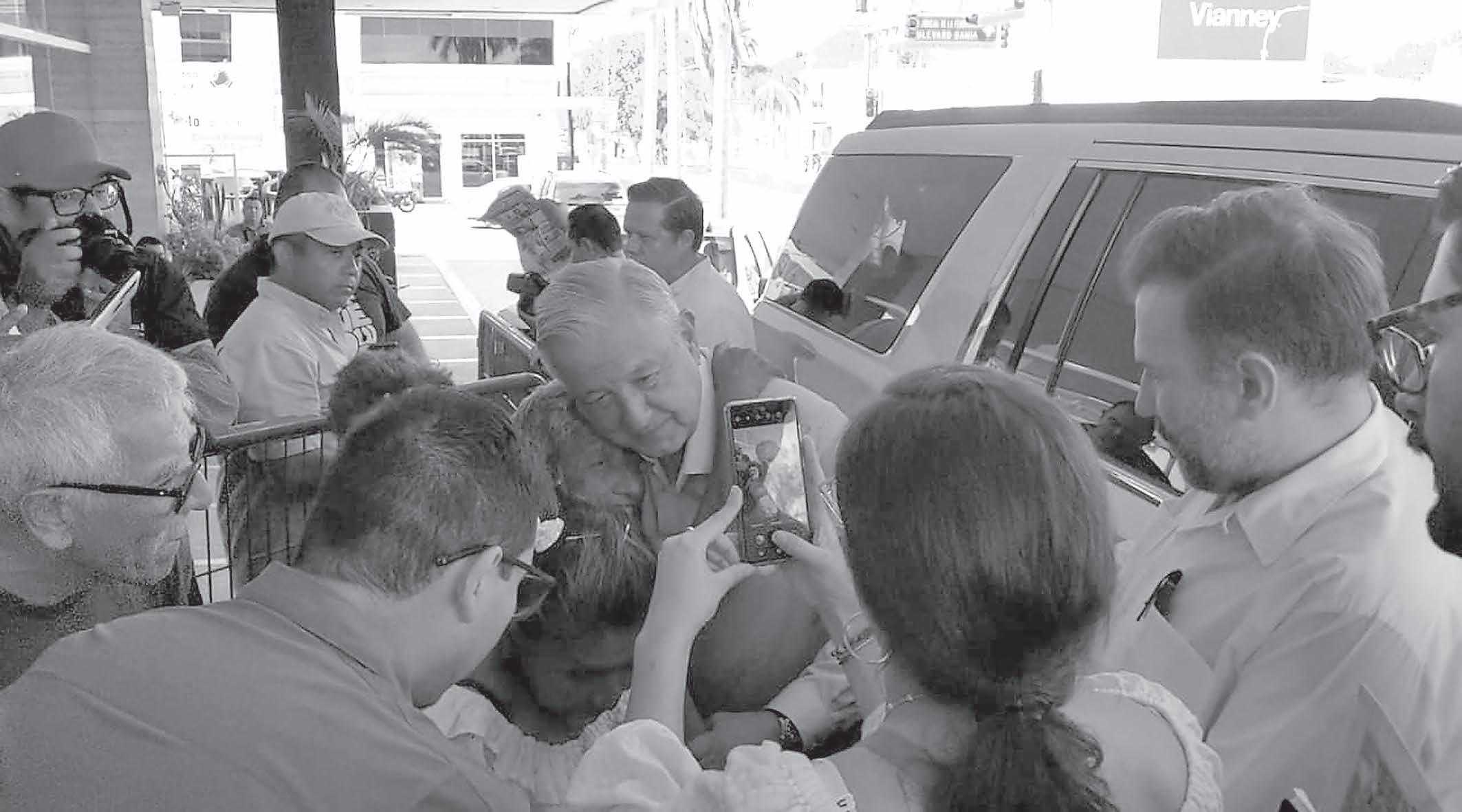 ANTES de sus recorridos aéreos, el Primer Mandario saludó ayer a más de una docena de ciudadanos que se dieron cita afuera del hotel donde se hospeda cuando visita la capital; el tabasqueño se dejó tomar fotos, además de aceptar peticiones y obsequios.- (POR ESTO!)