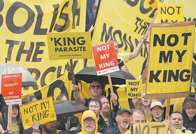 Miles de admiradores se agolparon a lo largo del recorrido de la carroza real. En su camino, la pareja real pasó ante las pancartas amarillas del grupo antimonárquico Republic, en que se leía “No es mi rey”. Al menos 52 organizadores de la protesta fueron detenidos incluso antes de empezar.