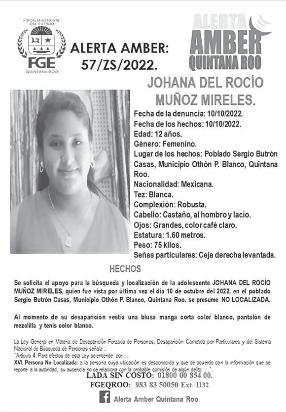 Se trata de Johana del Rocío Muñoz Mireles, de 12 años de edad, quien según la Alerta AMBER 57/ZS/2022, extravió el pasado 10 de octubre en la comunidad mencionada.