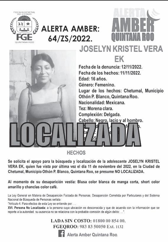 CHETUMAL.- La menor de edad que se encontraba desaparecida y por la cual se activó la Alerta AMBER el fin de semana pasado, fue localizada por elementos de la Policía Ministerial y entregada a sus familiares.