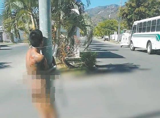 En las imágenes de un video, que se ha hecho viral en redes sociales, se logra ver al delincuente completamente desnudo y atado con cuerdas a un poste de luz sobre la calle.