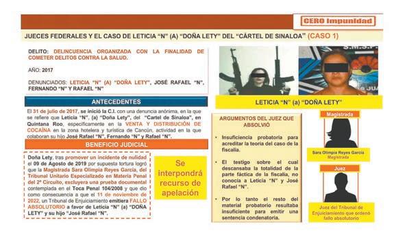 El funcionario Federal detalló que en cada uno de los procesos, de posesión de armas exclusivas del Ejército, liderar una célula criminal en Cancún, Quintana Roo, y de tráfico de estupefacientes, así como la de operación con recursos de procedencia ilícita, “La 40” o “Doña Lety” fue absuelta.